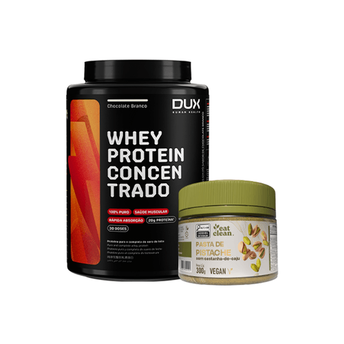 Kit composto por 1 Whey Protein Concentrado Chocolate Branco 900g e 1Pasta Pistache 300g.